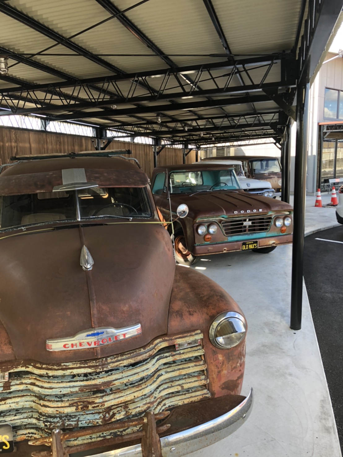 なんと、アメ車が置いてあり敷地内にはバイクの修理工場、アンティークショップが併設されています。