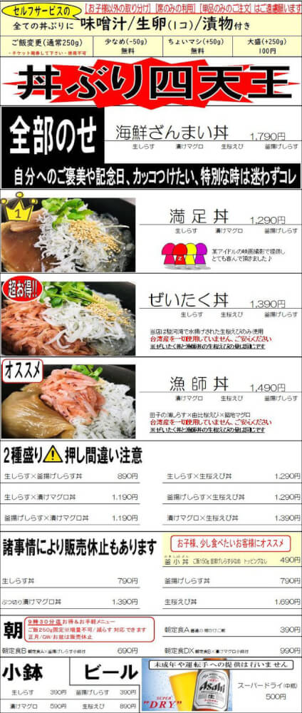 メインはやはりしらす丼!あとはこちらも富士市近海で取れる桜えびとのハーフ丼も人気の一品です。
