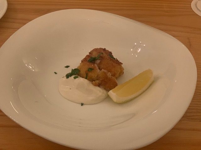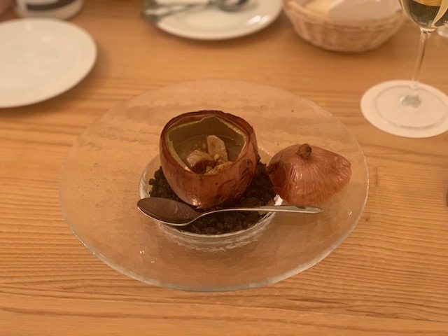 ペルシュウの後に出てきたのがタラの白子のカツレツと玉ねぎに詰めたフォアグラのスープです!!