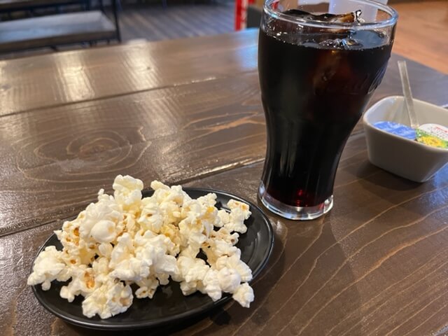 ランチセットには、ドリンクとポップコーンが付きます。なんかテンション上がりますね。