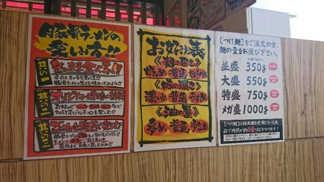 麺の量ですが、並盛350g(万人向け)、大盛550g(男子学生向け)、特盛750g(大食い向け)、メガ盛1000g(人間離れ向け)から選べます!!