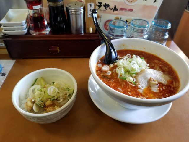 赤味ラーメンと唐揚げごはんセットを注文🎵見た目が凄く辛そうですが、少しピリッとする程度でそんなに辛くなく食べやすいので、ペロリと平らげちゃいました(笑)他にもまだまだ色々な種類のラーメンがございますので、ぜひ皆様立ち寄ってみてはいかがでしょうか🎵