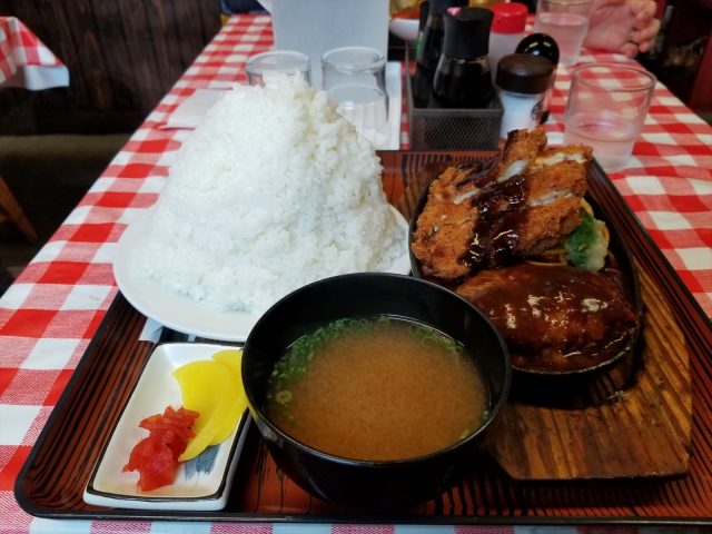 チキンカツはサクサクで、ハンバーグも超ジューシー♪そしてご飯は超大盛(*´ω`*)