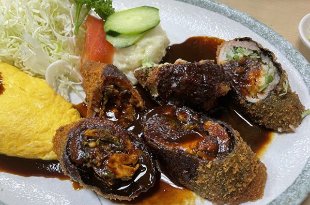 大葉とネギを肉と海苔で巻いていて