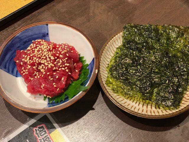 赤身の色がとても綺麗で、店長オススメの韓国のりに包んで醤油につけて食べるという食べ方!!!!最高においしいです!!!!