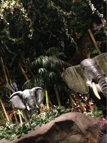 ジャングルをテーマにしたレストランで定期的に、猿が鳴き、象が吠え、雷鳴が轟きます。