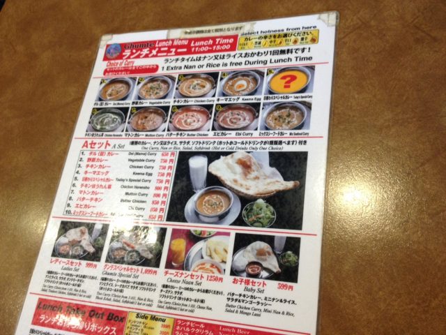 カレーとナンのセットだけでも10種類、他にレディースセットやスペシャルセット、チーズナンセット、お子様セットもあるようでした