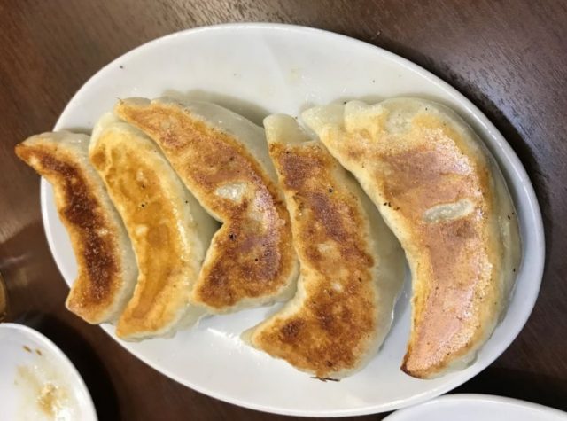 餃子は1皿、5個いり 皮が多分手作りなのでもっちもちでとってもおいしかったです。