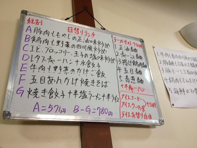 今日のランチメニューはこちら 日替わりランチだけで7種類 ラーメンセットもあるようです アイスコーヒーとウーロン茶ならプラス50円でつけることができます