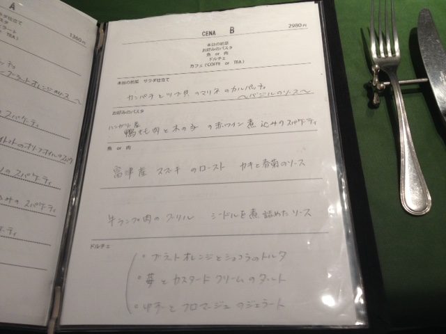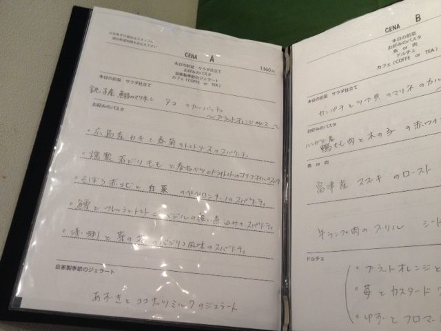 メニューはこちらAとBがありますが、Aにしました 1360円で前菜、パスタ、デザート、コーヒーがつきます