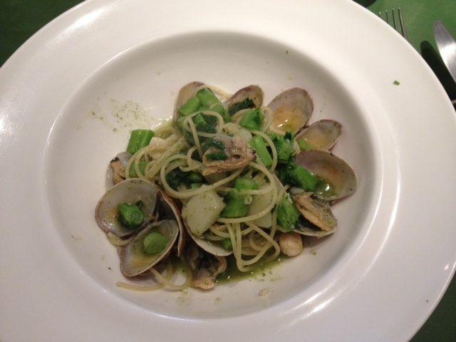 メインのパスタは 私は浅蜊と菜の花のバジリコ風味のスパゲッティ 浅蜊のダシとバジリコ風味がとてもよく、しかも具だくさん 麺のゆで加減がちょっと固めですが