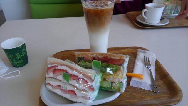 私はエビとアボガドのサンドッチとイチゴ大福とアイスカフェオレ 野菜たっぷりでソースがおいしいのですがソースの名前を忘れてしまいました、、