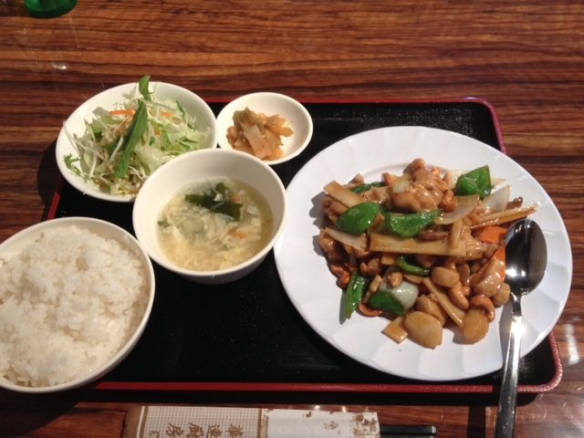 私は 鶏肉とカシューナッツ炒め 700円(たぶん税別) お漬物、サラダ、ライス、スープつき ボリューム満点であじつけもおいしかったです