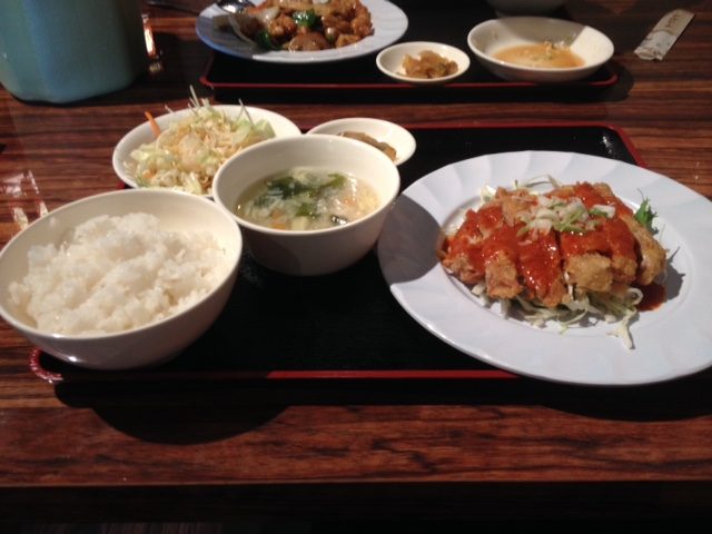 つれは油淋鶏 このソースが辛くて からいのが得意でないとちょっと無理なくらいからかったです、、、、 よそで食べた油淋鶏はからくなかったのでちょっとびっくりでした