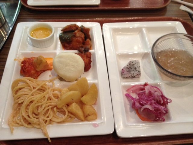 定番のからあげ、ポテト、パスタ、ピザやサラダバーなんかを食べました、 デザートはソフトクリーム機があるのでソーダフロートにしたり