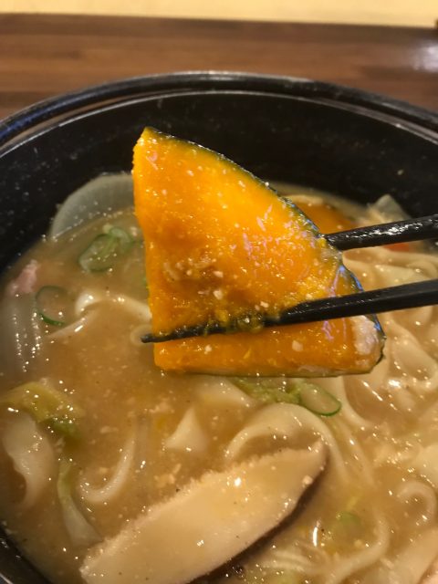 鍋の中には、カボチャごろーんと大きいの入って、メニュー名通り野菜多めです。麺は程よい固さで、味が染みてますね。