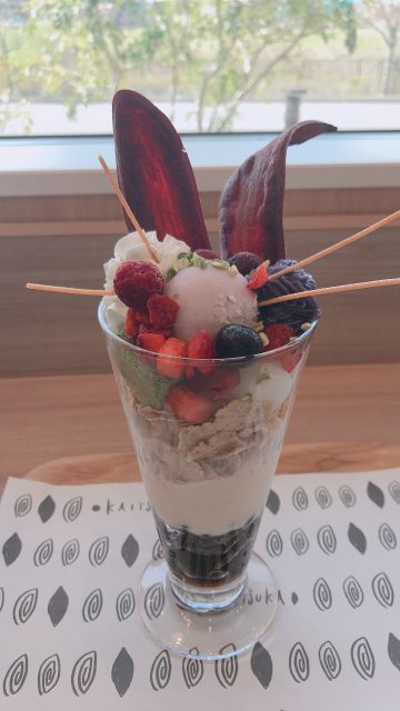 イートインでもいただきました 紫芋のパフェ 723円(税別) パリパリのお芋、紫芋のアイス、抹茶のわらび餅、生クリームにフルーツがアクセントになり
