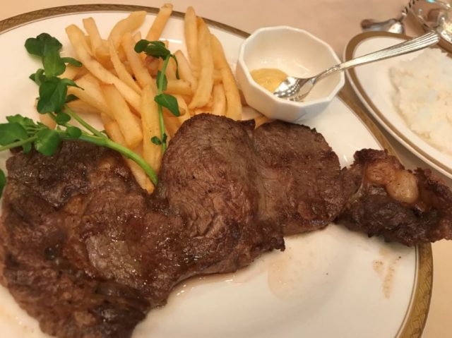 メインはリブステーキ(180g)、クレソン添え、ライス なかはレアでやわらかくってとーってもおいしかったです