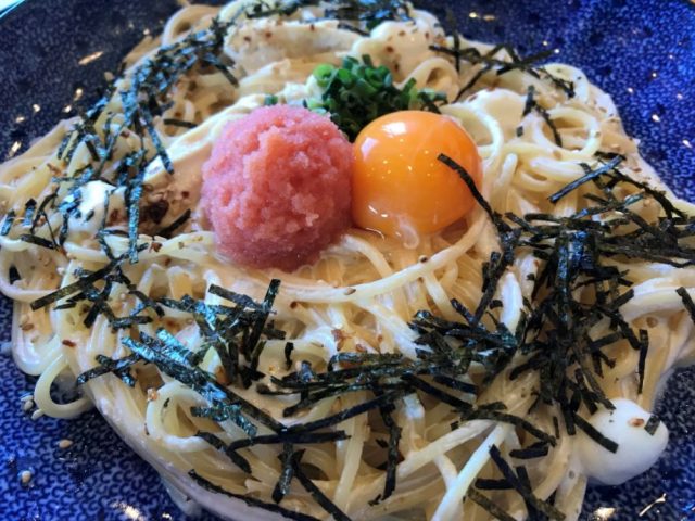 私はたらこと湯葉とモッツアレラのカルボナーラ1100円(税抜)にスープはついてきます