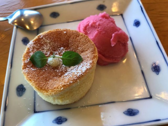 とろけるふわふわチーズケーキ、ラズベリーアイスぞえ 中にあつあつのチーズがはいってます