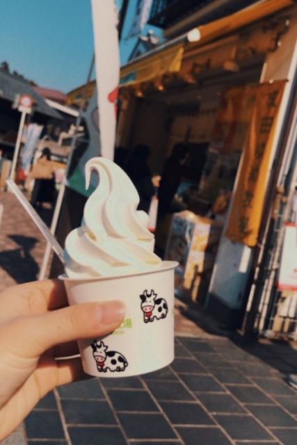 お参り後にゆめ牧場の生ソフトクリーム 380円 いれものがださかわいいです わりに量が多いのでおいしく満足できました