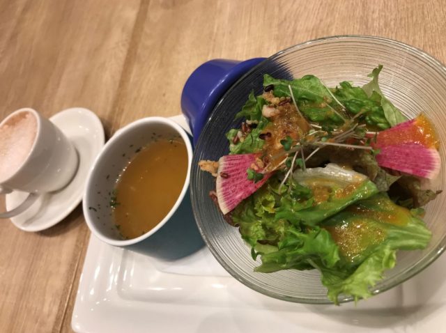 サラダとスープ、パスタ、ソフトクリーム、ドリンクバーがついています