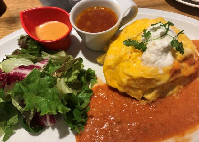 サラダ、オムライス、スープ、オムライスすべてがおいしいです