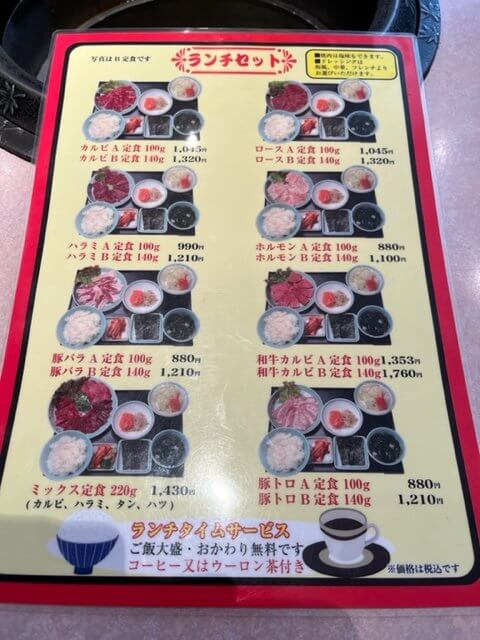和牛カルビ焼き肉の定食にはAとBがあり肉の量がそれぞれAは100g、Bは140gとなってます