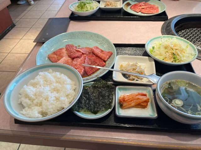 肉・ご飯・サラダ・キムチ・スープ・ノリがセットとなっていてご飯はお代わり自由だそうです