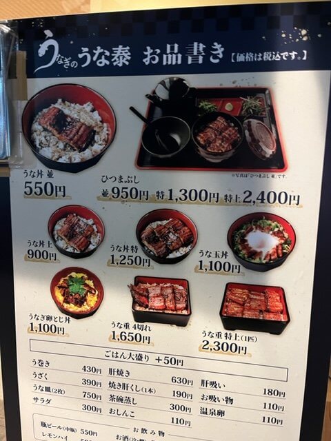 このメニュー見てください!! ウナギどんぶりが、ご、ご、ごひゃくえんですよ! (^^)!