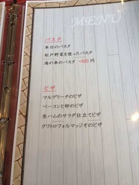 本日のパスタ 松戸野菜を使ったパスタと 海の幸パスタを注文。 松戸野菜を使ったはたぶんネギがはいったトマトソースのパスタ、海の幸パスタは魚介が大き目でどちらもおいしかったです