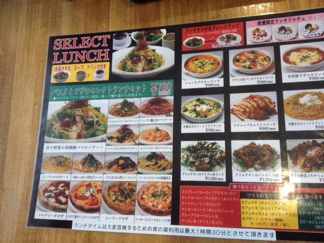 パスタ、ピザなら780円 グラタンやラザニヤももう少しお金をだせば選べるようです