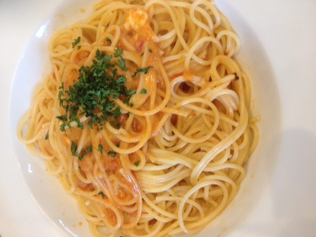 私はモッツアレラチーズのトマトクリームお友達は小柱いっぱいの明太子ソースにしました パスタの量は結構多めでした