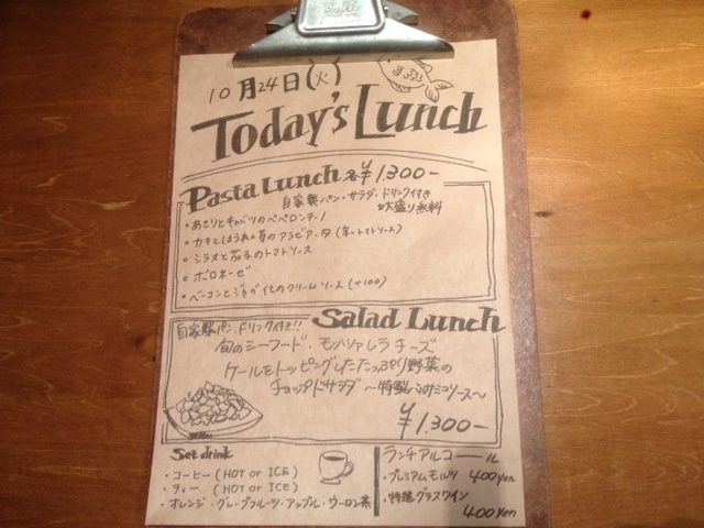 メニューはこちらパスタランチ(パン・ドリンクつきで1300円)とサラダランチ パスタは5種類の中から選べます あと大盛りが無料でした!