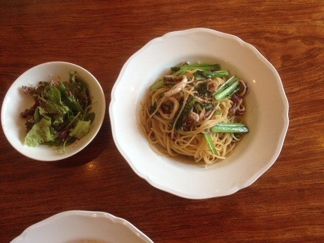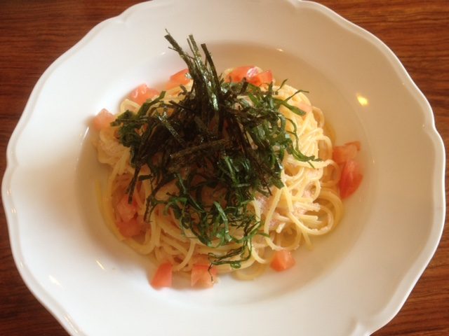 私はたらこと大葉とトマトのパスタ お友達はヤリイカと小松菜のパスタ