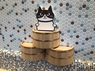 風呂桶に乗った猫ちゃん(風呂桶に道後ぷりんを置いて撮影するのが映え♪)