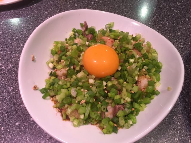 ホルモンのお刺身:脂のたっぷり乗ったホルモンの刺身。特性タレと卵の黄身を絡めて・・