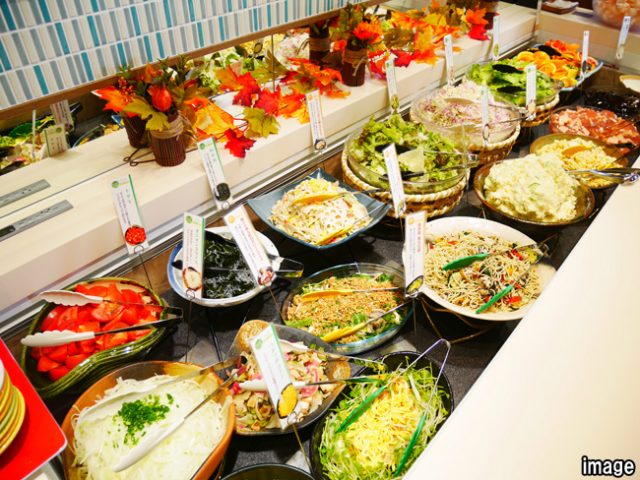 サラダバーは、常時20種類以上が用意されており、種類豊富な野菜はもちろんのこと、ゼリーやパスタサラダ・ケーキ・えびせんなどもあり、時間によって種類が変わっていきます。