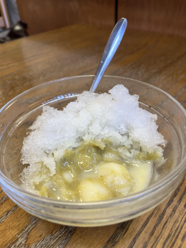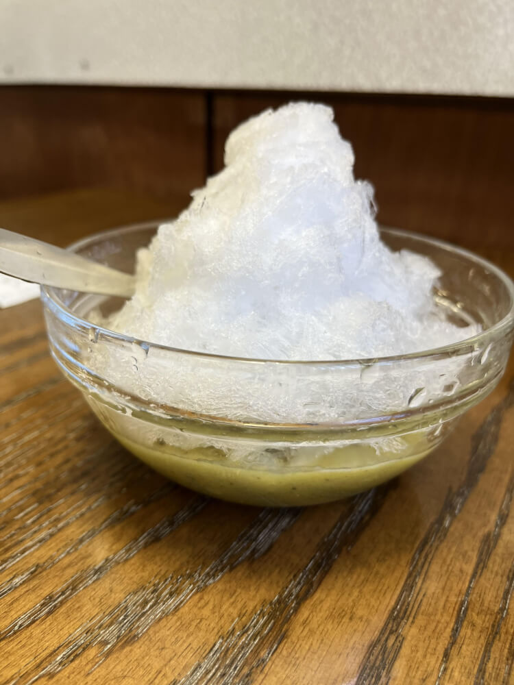 餡がかかったお餅の上にフワフワのかき氷がのっています。