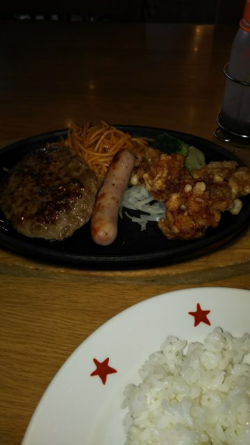 この日のランチは、ハンバーグ・ソーセージ・唐揚げ・パスタに飲み放題スープとお替りし放題の