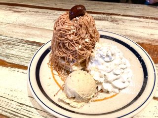 などハワイらしいメニューが並ぶ中、今回のお目当ては、期間限定メニューの「コナズモンブランパンケーキ」でした🌰🥞🌰