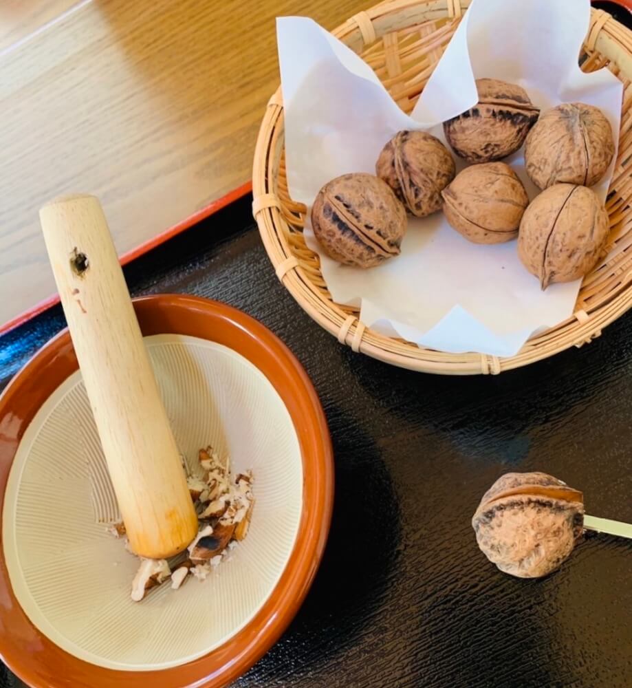 そばつゆにクルミペーストが添えてあるのかと思いきや、自力で殻を割って実を取り出さなければならないようです。