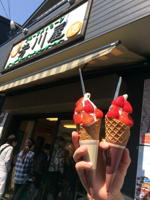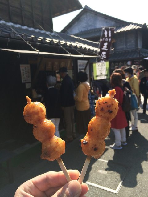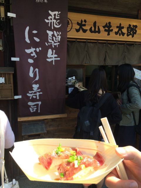 お城を堪能したら小腹がすいたので城下町にあった、五平餅、飛騨牛握り寿司、いちごソフトを食べ歩きです。