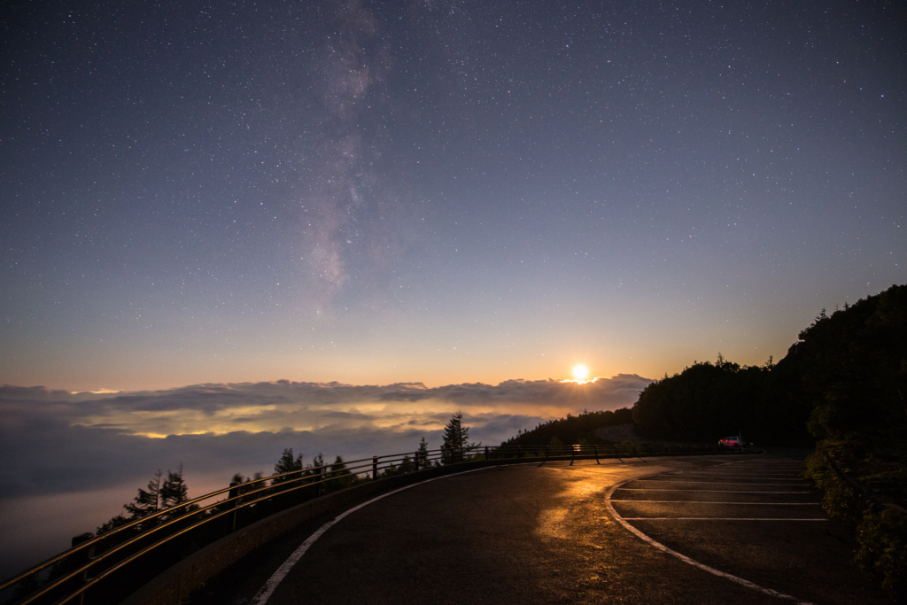 画像中央の白いモヤは天の川です。時間帯によっては山に隠れてしまいますのでタイミングを間違えないように゚゚φ(..)メモメモ