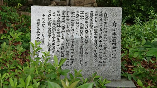 先日大阪市中央区を散歩してたら、大阪衛生試験所発祥の地という石牌を見つけました。