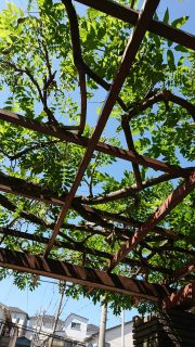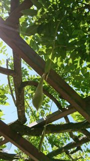 ベンチの上に、日射しよけになる木がありましたが、なぞのお豆さんみたいな物がブラリ。。