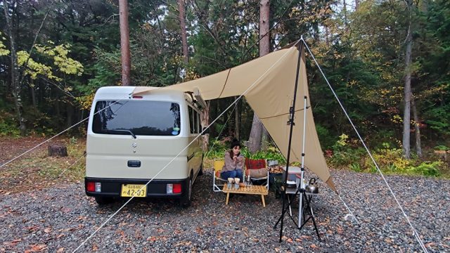 キャンピングカーに持参したタープを付けて雨もへっちゃら~♪