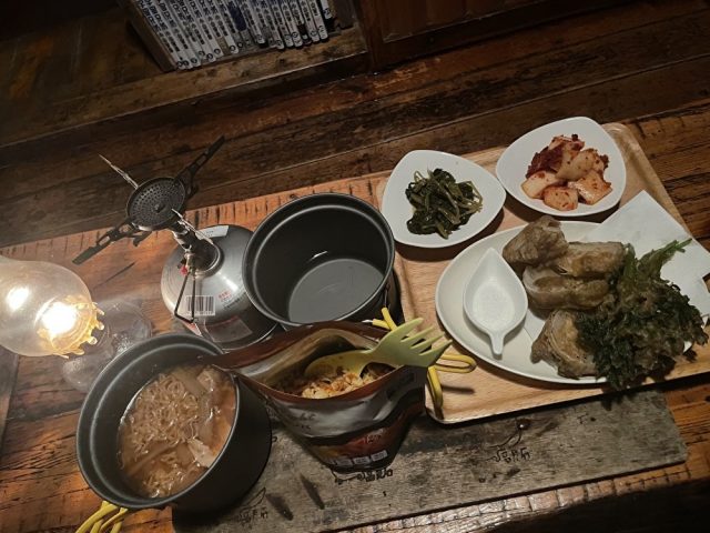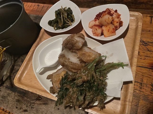 小屋の前でとれたよもぎと新玉ねぎの天ぷらを出してくれました。