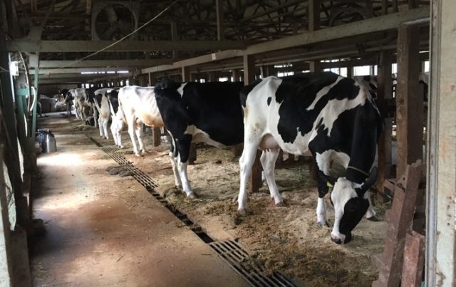 まずは牛さんに会いに牛舎へ。ほとんどは白黒の毛並みの乳牛ですが、黒毛も何頭かいます。
