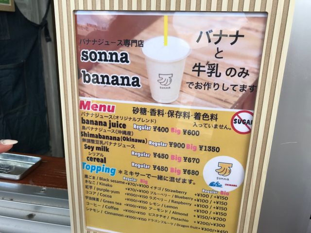 さて、最近都内でもよく見かけるバナナジュース専門店、「そんなバナナ(sonnabanana)」が沖縄に出店した、と聞いたので視察も兼ねて行ってきました。